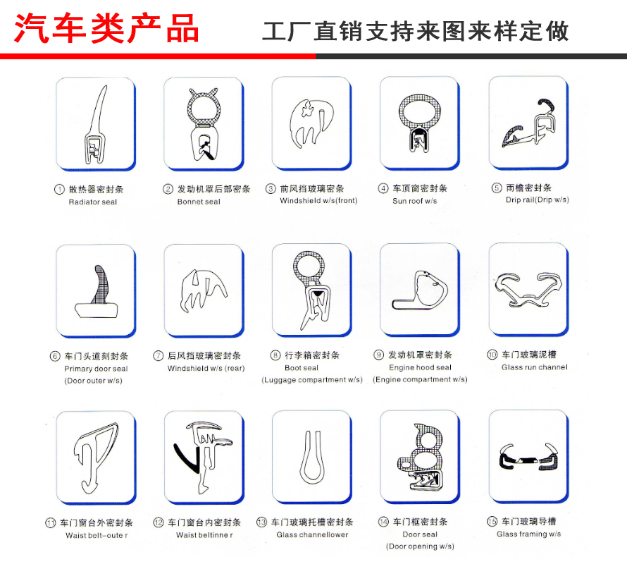 常用天候密封條有門框密封條、行李箱密封條、發(fā)動機箱蓋條等。常用一般密封條有前后風(fēng)窗密封條和角窗密封條、內(nèi)外側(cè)條等。